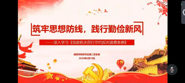 研究生第三党支部书记宋冰蕾带领各位党员同志深入学习了《党政机关厉行节约反对浪费条例》,深入解读了核心内容并进行典型案例警示教育,以严实作风发挥先锋模范作用,为建设节约型校园和社会贡献力量!