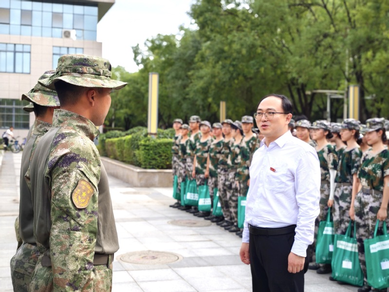 贾侃代表学院对承训教官的专业素养与辛勤付出表达诚挚谢意。详细了解了军训开展情况、训练进度和学生表现,希望同学们珍惜军训时光,认真服从指挥,在训练中磨练坚强品格,增强集体荣誉感,以饱满的精神面貌开启大学新征程。