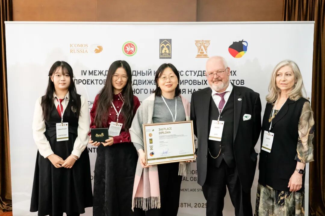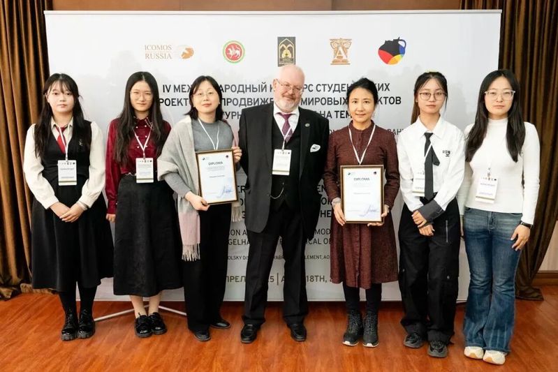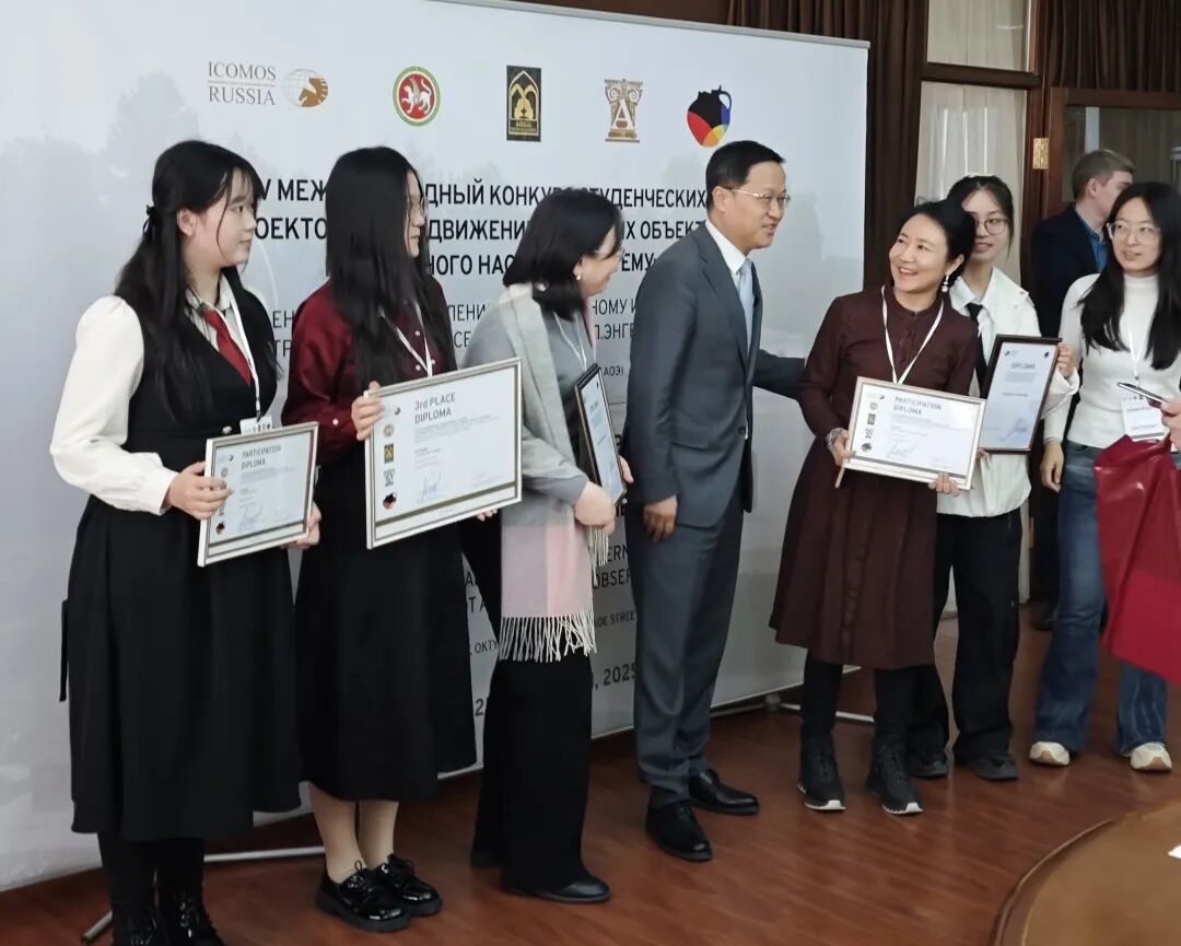 现场竞争激烈,各组队伍方案特色鲜明。由建筑领域的权威专家、文化遗产保护、天文学和其他相关学科领域专家共同组成的国际评审团对投标作品进行评估,最终,学院两只代表队伍荣获ICOMOS-RUSSIA颁发的特殊奖。其中,由王少锐老师带领的学生团队(李宜航、夏天舒)荣获第三名的佳绩,中国驻俄罗斯喀山市总领事馆出席颁奖仪式并对获奖团队表示祝贺。
