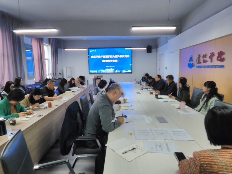 为持续提升学院干部履职能力,10月15日上午,在南校区西院建筑学院三楼会议室,建筑学院召开干部履职能力提升系列培训-新闻写作专题会议。会议邀请学校党委宣传部校报编辑部和燕老师主讲。学院全体院领导、党支部书记及宣传委员、系所主任及科级干部参加培训,会议由院党委书记贾侃主持。