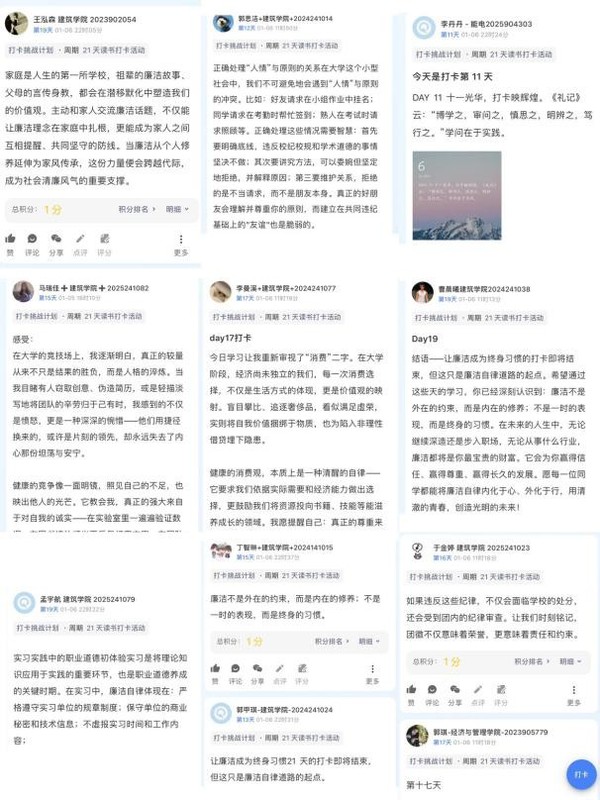 为深化校园廉洁文化建设、强化考风学风教育,提升学生廉洁自律与诚信治学意识,营造风清气正的育人氛围,建筑学院面向全体学生开展为期21天的“清风筑梦、廉韵筑魂”清风打卡行动。活动于2025年12月17日启动,2026年1月6日收官,吸引248名学生参与,实现廉洁教育与考风学风教育同频共振。