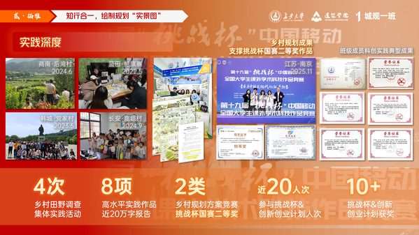 科研实践,扎根专业土壤。学术领域,班级成员累计发表论文 7篇,2次在规划界顶尖学术年会进行宣讲,展现出超越本科阶段的学术素养。实践层面,班级同学 4次深入乡村开展调研,累计形成 8项高水平实践作品,相关成果得到刘加平院士等行业专家的高度认可。外语能力同样领跑全院,英语四级全员通过,六级通过率达 77.42%,在全国大学生英语竞赛中斩获省级特等奖、全国总决赛一等奖等荣誉 10余项,班级成员通过“双语角”与多国留学生交流,奋力向世界讲好中国规划故事。
