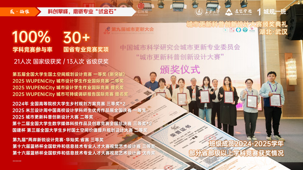 学科竞赛,燃动青春赛场。班级100%全员参与国省级竞赛,累计斩获荣誉30余项。在国内规划专业级别最高的“国土空间规划设计竞赛”中,班级同学带队斩获全国一等奖,更作为全国高校唯一的本科生代表受邀在闭幕式发言。此外,还斩获 “挑战杯”国赛二等奖、“大学生乡村规划方案竞赛”国家级奖项等多项重磅荣誉,用实力刷新成长高度。
